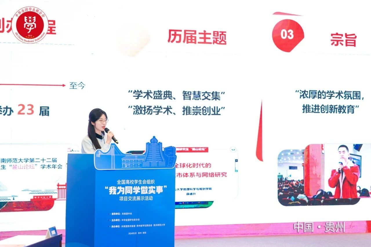 由共青团中央指导、全国学联主办、团贵州省委、贵州省学联、贵州师范大学承办的首届高校学生会组织“我为同学做实事”项目交流展示活动于3月21日-24日在贵州师范大学举行,活动贯彻落实学思想·做实事·树新风要求,与会各高校积极开展交流。