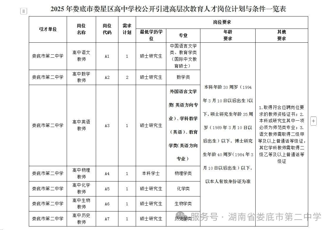 湖南省首批特色教育实验学校——娄底市第二中学欢迎青年才俊的加入,我们有8个名额,语文1人、数学2人、英语1人、物理1人、化学1人,生物1人、历史1人。研究生每年补助1.8万,本科生(仅限物理)每年补助1万,连续5年。