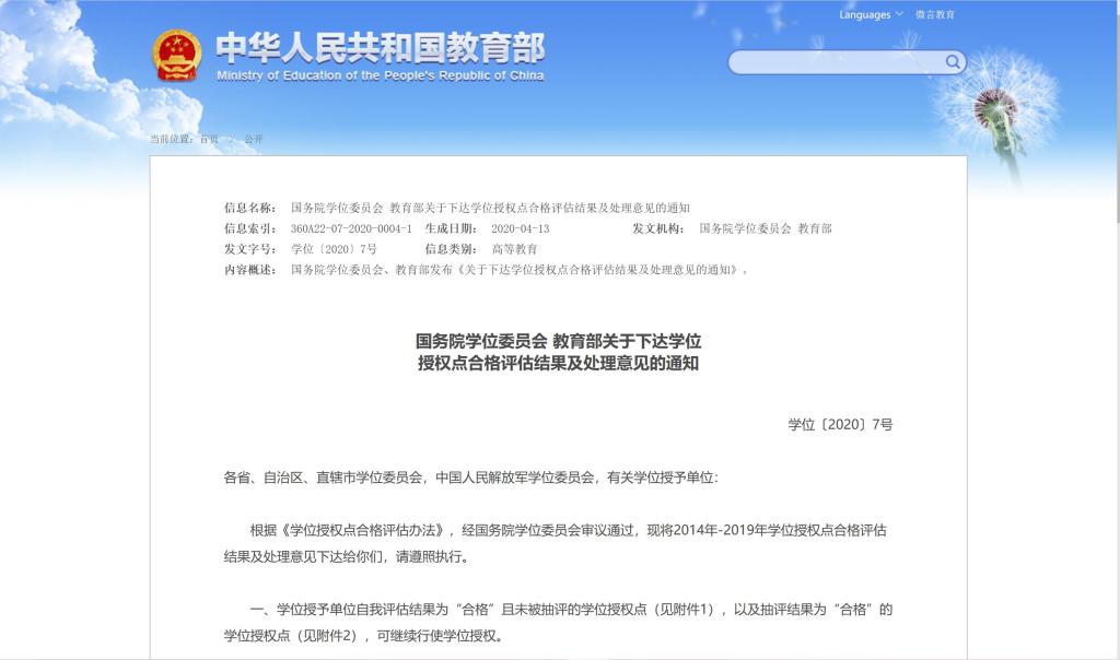(通讯员 王潇)近日,国务院学位委员会、教育部下达了2014年—2019年学位授权点合格评估结果及处理意见(学位〔2020〕7号),我校参评的14个一级学科博士学位点、8个一级学科硕士学位点、4个硕士专业学位点全部合格,可继续行使学位授权。