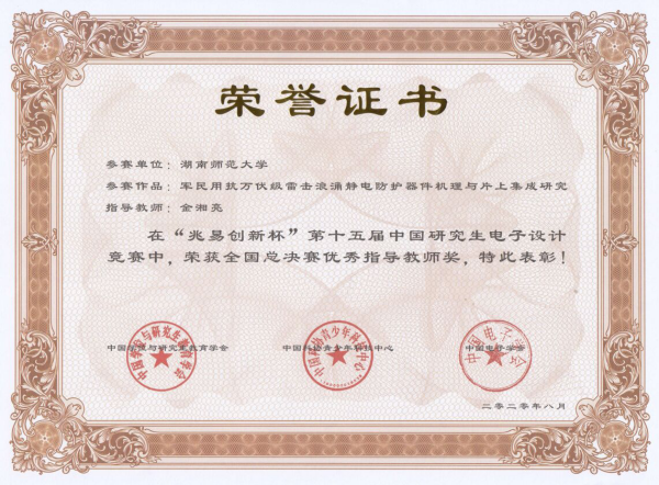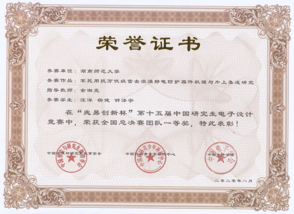 (供稿物电院)近日,“兆易创新杯”第十五届中国研究生电子设计竞赛全国总决赛在南京信息工程大学举行。我校物理与电子科学学院汪洋、杨健、钟泽宇3位研究生完成的项目《军民用抗万伏级雷击浪涌静电防护器件机理与片上集成研究》荣获一等奖,金湘亮教授被评为优秀指导老师。