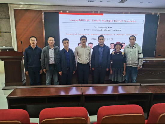 讲座结束后,在场的老师和同学们与刘教授进行了交流讨论,刘教授耐心详细地解答了听众的问题。此次报告使听众加深聚类数据的相似度问题与简单多视图聚类算法的认识,拓展了大家的视野,也为老师同学们的研究思路提供了很多启示,大家收获颇丰。报告结束后,邀请刘新旺教授与我院代建华、张连明、付玉、肖林、王润民、李扬定老师代表一起合影留念。