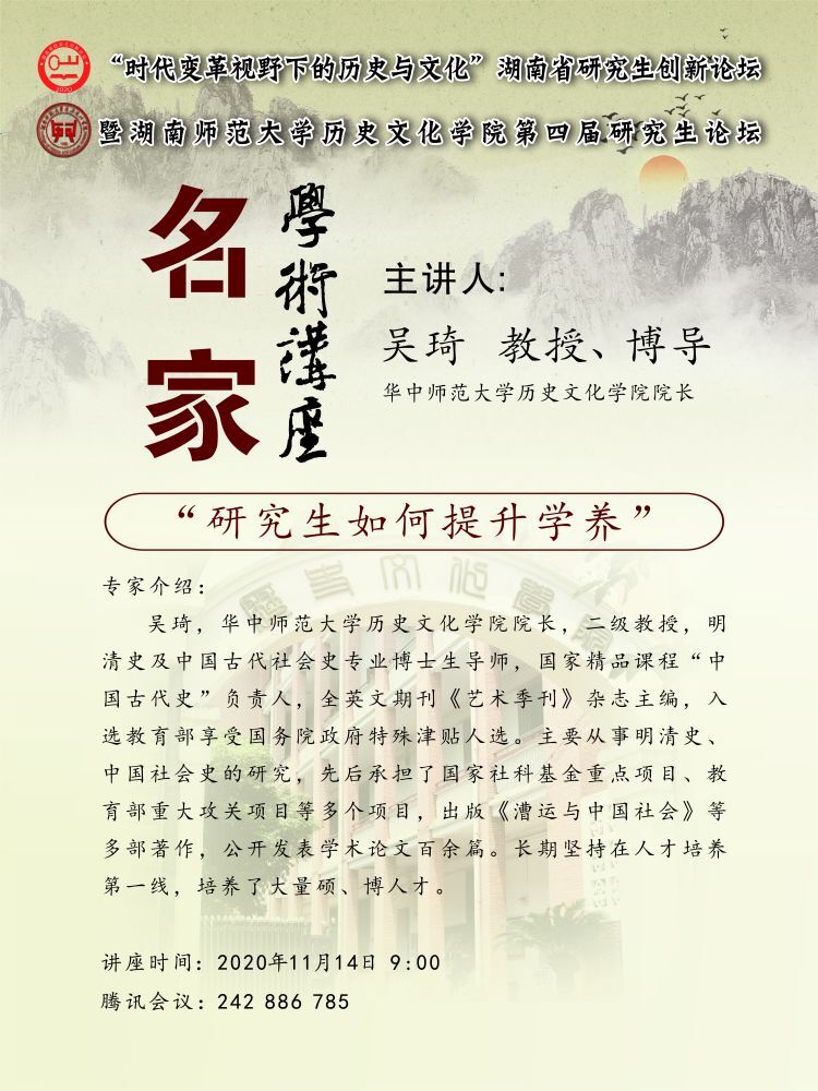 (通讯员 陈思虹)11月14日上午九时,“时代变革视野下的历史与文化”湖南省研究生创新论坛暨太阳集团tyc151历史文化学院第四届研究生论坛名家学术讲座第二场于腾讯会议线上平台开展。华中师范大学历史文化学院院长、二级教授、明清史及中国古代社会史博士生导师吴琦教授受邀开展题为“研究生如何提升学养”的讲座。讲座由我院副院长刘利民教授主持。