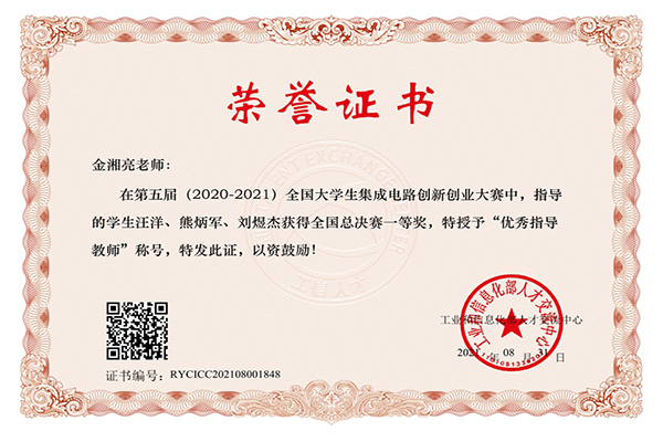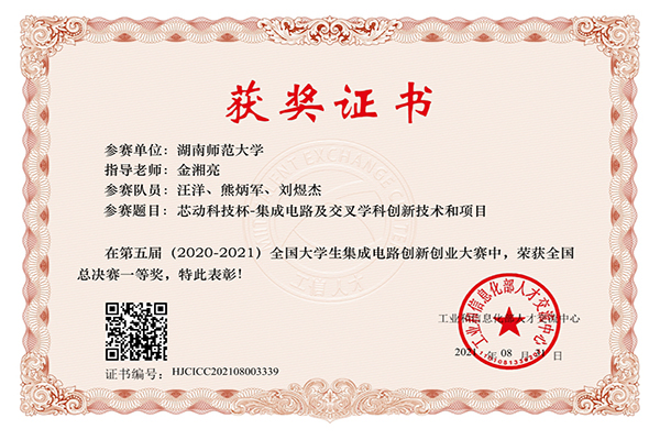 (供稿 物理与电子科学学院)近日,第五届全国大学生集成电路创新创业大赛总决赛在重庆举行,由我校物理与电子科学学院金湘亮老师指导,汪洋、熊炳军、刘煜杰完成的项目《极弱光探测用硅基SPAD机理、器件与集成研究》荣获一等奖,金湘亮老师荣获优秀指导教师称号。