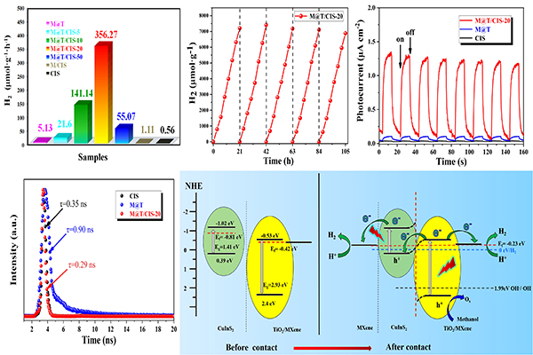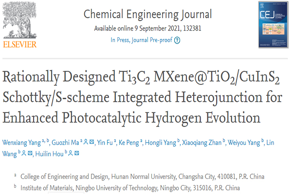 (供稿 工设院)随着全球气温变暖加速,氢能源作为清洁低碳能源,受到国家的大力支持,在“十四五”规划中更是提到要加速氢能产业发展,氢能相关技术的研发得到了科研工作者的广泛关注。在光催化制氢研究方面,开发新型高效的异质结光催化剂仍然是实现高效太阳能-化学能转换的一个具有挑战性的问题。日前,我校工程与设计学院硕士研究生杨雯翔在能源光催化领域取得重要进展,并以第一作者身份将研究成果以“Rationally Designed Ti3C2MXene@TiO2/CuInS2Schottky/S-scheme Integrated Heterojunction for Enhanced Photocatalytic Hydrogen Evolution”为题发表在国际顶尖期刊Chemical Engineering Journal(IF:13.273,JCR和中科院一区Top)。论文链接: