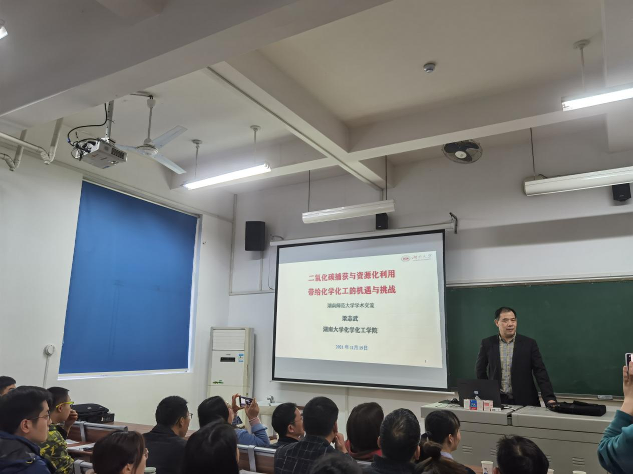 (供稿 化学化工学院)11月19日下午,以“化学化工前沿”为主题的微型课程在化工院117教室开讲。本次课程邀请中南大学刘又年教授和湖南大学梁志武教授担任主讲。内容涉及二氧化碳捕获与资源化利用和纳米催化药物体系的多模式抗肿瘤作用等多个化学化工前沿研究领域。