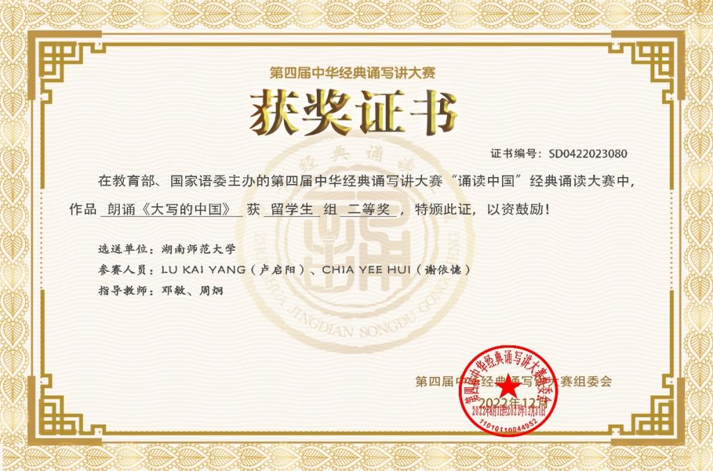 (供稿 国汉院)近日,由教育部、国家语委主办的第四届中华经典诵写讲大赛“诵读中国”经典诵读大赛总决赛圆满落下帷幕。我校国际汉语文化学院教师邓敏、周炯指导的2022级马来西亚研究生卢启阳、谢依憓朗诵的参赛作品《大写的中国》荣获留学生组全国二等奖。