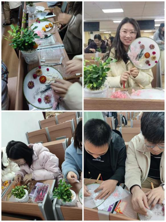 “心境雅趣,制扇至美”永生花团扇制作活动中,同学们在“闻一闻、学一学、做一做”中体验着中国古代团扇文化和现代永生花艺术相结合带来的别样趣味,独具一番风格。大家一边制作着永生花团扇,一边交流心得,虚心求教,相互协作,整个活动现场弥漫着浓厚的创作热情和年轻人们的欢声笑语。