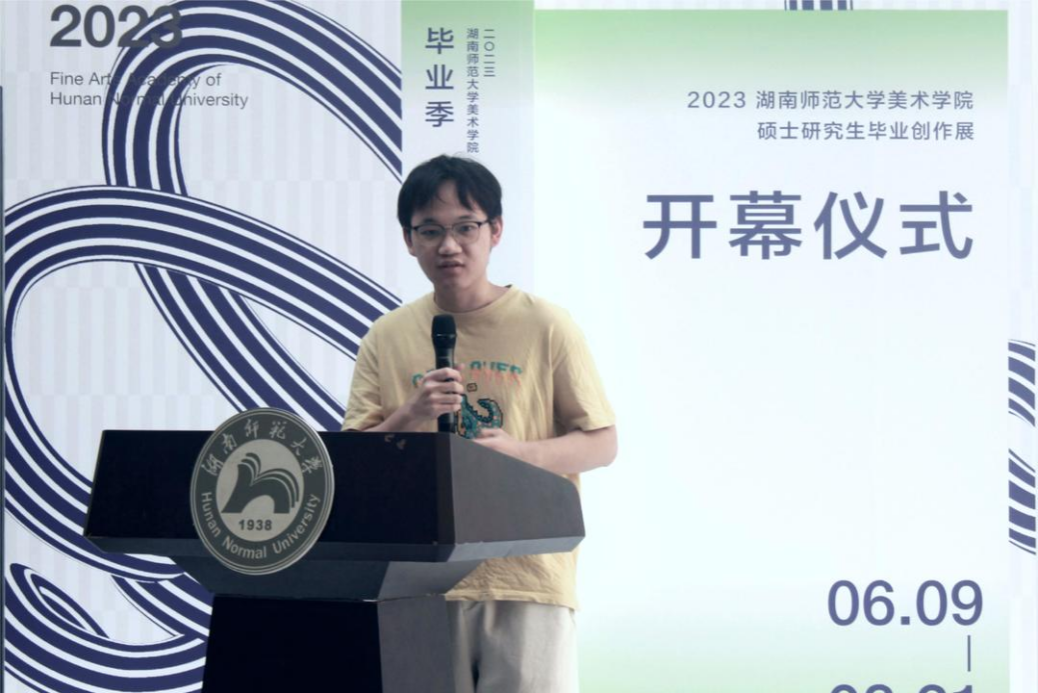 学生代表林嵩山发言,他表示,此次毕业作品展不仅仅是我们研究生三年学习生活的句号,更是同学们艺术生命又一个崭新的起点。每件作品在短暂却又漫长的时光中累积、沉淀、尝试和诞生,承载着理想和希望,凝聚着辛勤耕耘的汗水、不懈的努力与执着,诠释着年轻一代对美的理解和感悟。他祝愿每一位同学能在新的社会大舞台上充分展示自己的才华,实现自己的理想抱负。