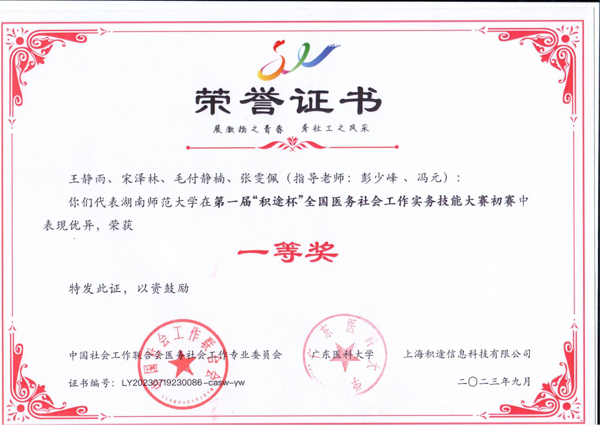 近日,第一届全国医务社会工作实务技能大赛线上赛举行,由太阳集团tyc151公共管理学院社会工作专业硕士生王静雨、宋泽林、毛付静楠、张雯佩组成的“医路有你”团队,获得硕士生组一等奖。指导教师为彭少峰和冯元。