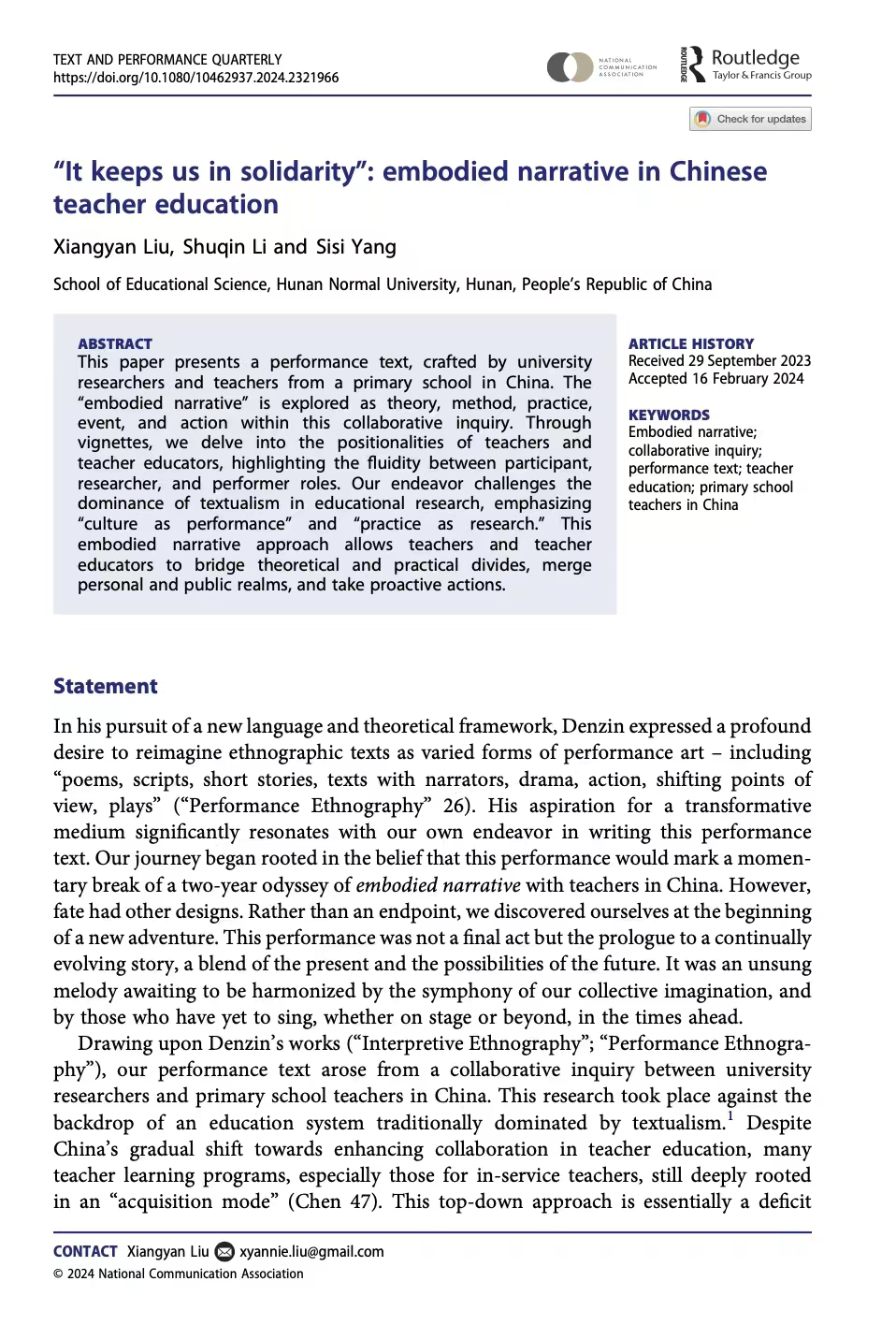 (通讯员 丁文珺)近日,太阳集团tyc151教育科学学院刘湘燕老师所在项目组,在国际期刊Text and Performance Quarterly(JCR人文艺术类A&HCI收录分区Q1)发表了题为“It keeps us in solidarity”:embodied narrative in Chinese teacher education的论文。刘湘燕老师为第一兼通讯作者,2021级课程与教学论方向博士生李书琴和2021级教育学原理方向硕士生杨思思为第二、第三作者。该论文是太阳集团tyc151教育科学学院教育现象学研究中心的科研成果。