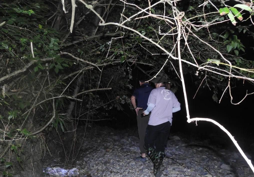 “寻蛇之路”上,因为脊蛇一般夜晚出没,队员们就每到晚上七八点全副武装,带好捕蛇的蛇钳,备好急救的药品,打着照明的手电灯,沿着小溪边、在落叶下一寸一寸搜寻。直到次日凌晨三四点,队员们才走出深山。