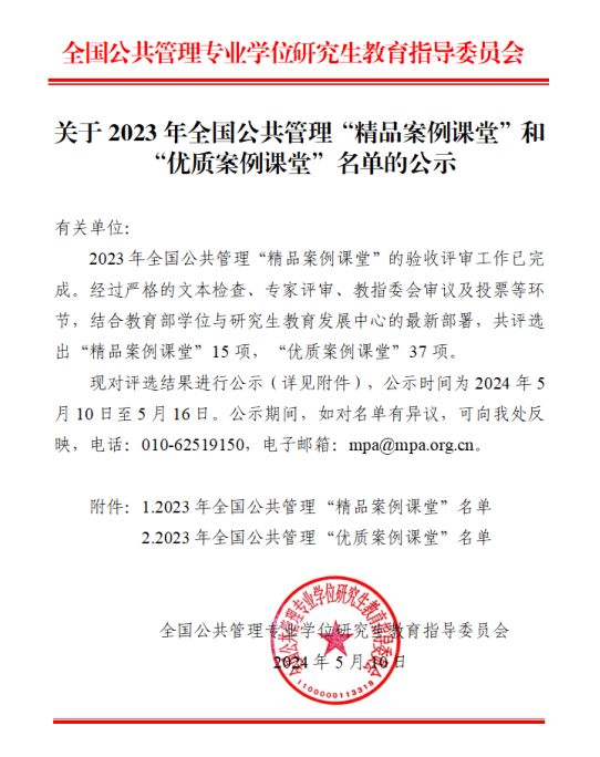全国公共管理“精品案例课堂”和“优质案例课堂”项目是教育部学位与研究生教育发展中心委托全国公共管理专业教学指导委员会开展的案例教学公开课项目,旨在加大案例教学力度、带动案例教学方法创新和理念传播、探索公共管理专业学位案例教学范式、推动案例更好服务实践创新人才培养。此次成功入选全国公共管理“优质案例课堂”是我校MPA教育教学改革取得的又一重要成果,是我校高度重视研究生培养质量,不断深化研究生教育综合改革的重要体现。我校公共管理学院将以此为契机,继续推进教学案例的开发,加强教学过程中理论与实践的融合,不断优化教学方法,全面提升MPA人才培养质量。