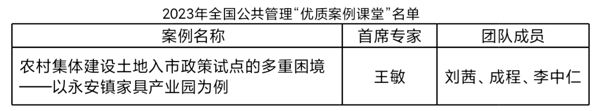 (通讯员 潘佳妮)近日,我校公共管理学院王敏教授主持的MPA案例课堂,在2023年全国公共管理“精品案例课堂”评选中,经过激烈的竞争与严格的审核,最终脱颖而出,荣获“优质案例课堂”称号。