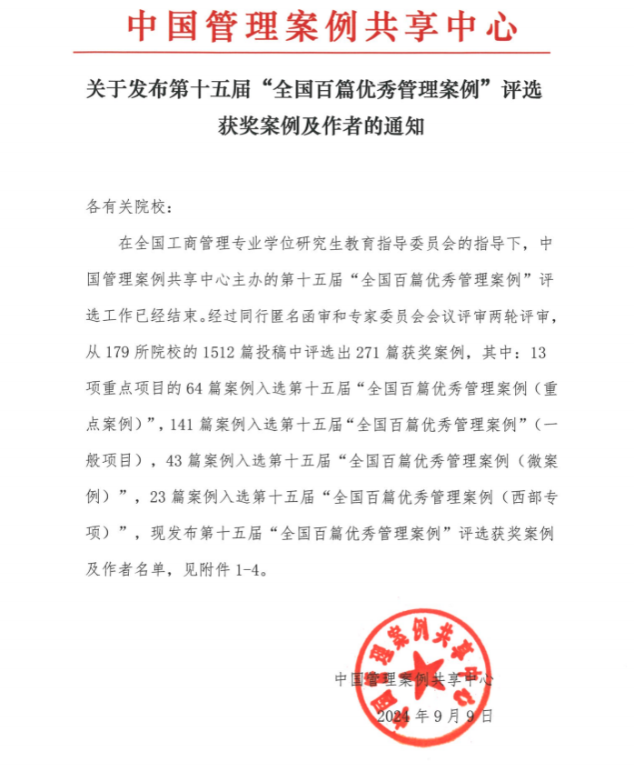“全国百篇优秀管理案例”评选由全国工商管理专业学位研究生教育指导委员会指导、中国管理案例共享中心主办,是我国管理案例评选的最高奖项。“百优案例”评选自2010年起每年举办一届,致力于开发中国本土原创高质量案例,推动和提高中国管理案例教学与研究水平,并先后被纳入教育部学科评估指标体系(C5指标)和工商管理硕士专业学位水平评估指标体系(C1指标),成为衡量商学院办学水平的重要考核指标。
