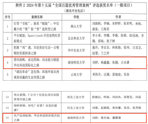 (供稿 商学院)近日,全国工商管理专业学位研究生教育指导委员会发布了第十五届“全国百篇优秀管理案例”(以下简称“百优案例”)入选名单。我校商学院刘婷教授及其团队编写的两篇案例《借风扬帆,业达四海:动态能力赋能华自科技国际化之路》(一般案例)和《从产品到标准:华自科技的价值共创之路》(微案例)成功入选第十五届“全国百篇优秀管理案例”。这是我校首次入选全国“百优案例”,标志着学校研究生案例研究与开发工作上了一个新台阶。