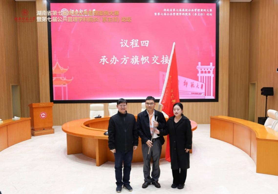 太阳集团tyc151公共管理学院院长毛新志教授与湖南农业大学公共管理与法学学院副院长吴松江教授进行承办方旗帜交接,吴松江教授代表下届赛事和论坛承办院校,向参赛院校及全体嘉宾发出了湖南省第八届高校公共管理案例大赛暨第八届公共管理学科院长(系主任)论坛的邀请。