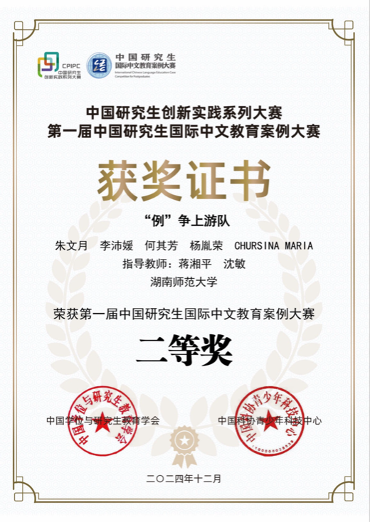 (供稿 国际汉语文化学院)近日,第一届中国研究生国际中文教育案例大赛决赛在上海华东师范大学落下帷幕。由我校国际汉语文化学院蒋湘平副教授、沈敏教授指导,国际汉语文化学院2023级对外汉语专业研究生朱文月、李沛媛、何其芳、杨胤荣,2024级国际中文教育专业研究生玛丽娅(俄罗斯)撰写的案例《AI助力新手教师实现备课飞跃》荣获全国二等奖。