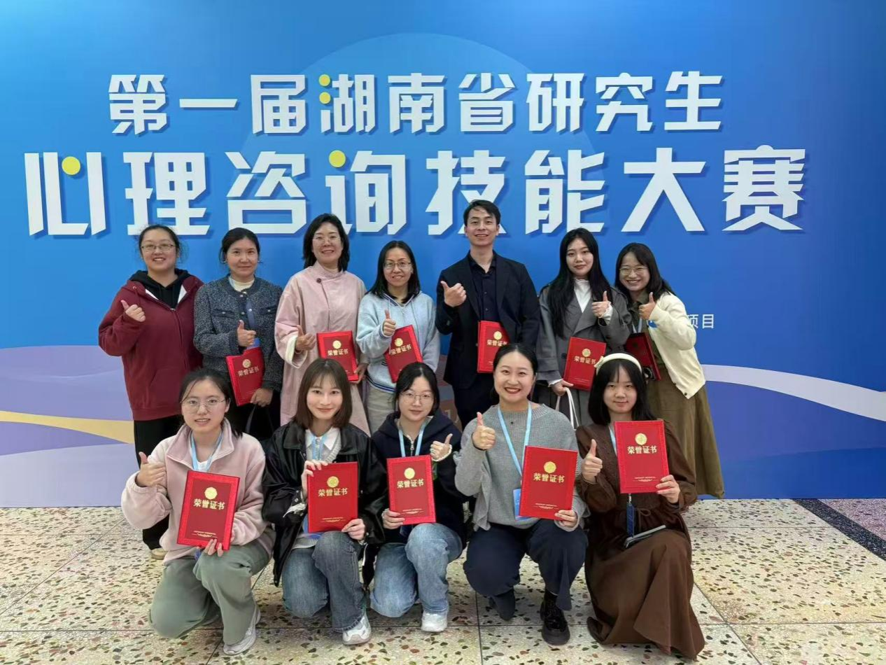 近年来,我校不断健全实践教学体系,强化技能训练、案例讨论、督导机制与竞赛训练的一体化培养模式,为青年教师和研究生提供了优良的实践平台。本次比赛成果不仅展示了我校师生的专业实力,也充分体现了心理健康教育人才培养方面的扎实积累。未来,学校将继续推进心理健康教育人才培养改革,深化实践育人体系建设,努力为湖南省乃至全国培养更多高质量心理咨询与心理健康教育专业人才,为推动区域心理健康工作发展贡献更多“师大力量”。