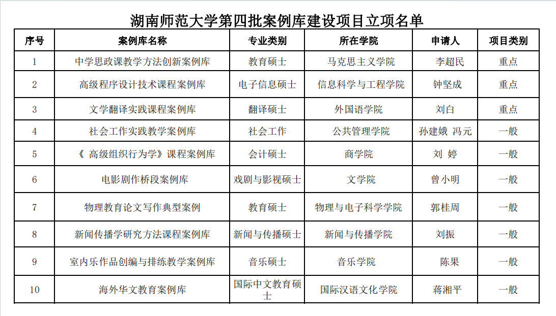 根据《教育部关于加强专业学位研究生案例教学和联合培养基地建设的意见》(教研〔2015〕1号)和《关于做好专业学位研究生课程案例库第三批建设项目结项和第四批建设项目申报工作的通知》(研究生院通〔2023〕46号)文件精神,我校组织开展了第四批专业学位研究生课程案例库建设项目的立项评审工作。经学院申请、专家评审,并报学校批准,同意对《中学思政课教学方法创新案例库》等3个案例库重点项目、《社会工作实践教学案例库》等7个案例库一般项目(见附件)立项建设,现予公布。