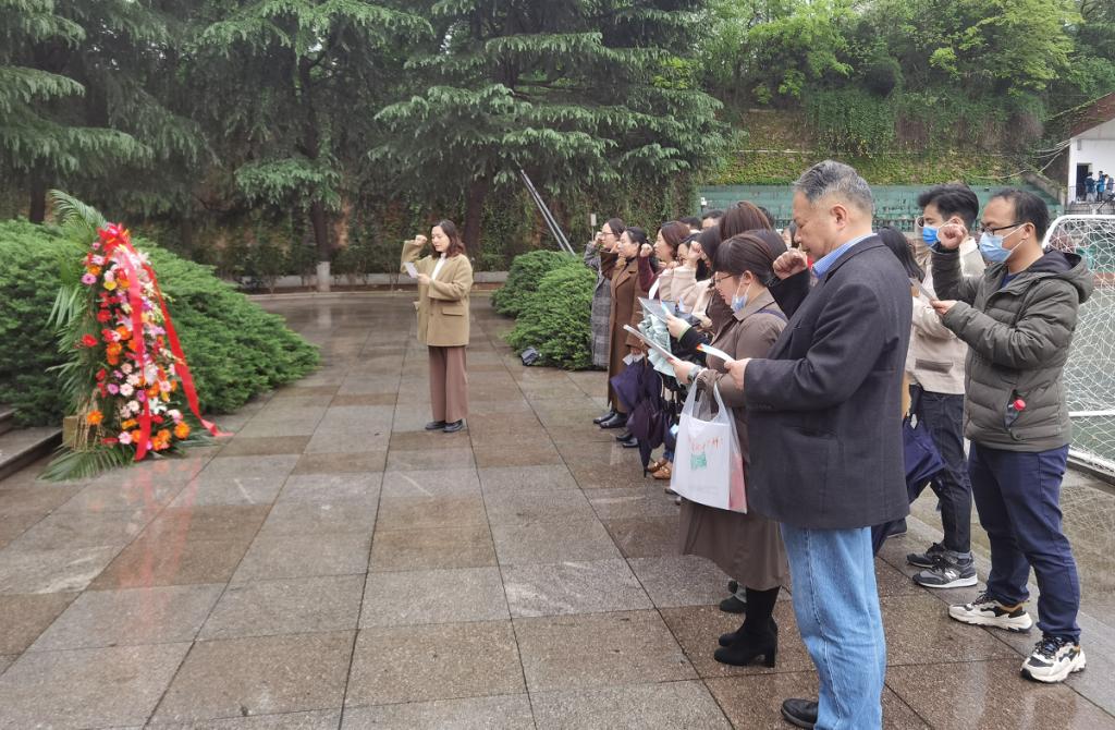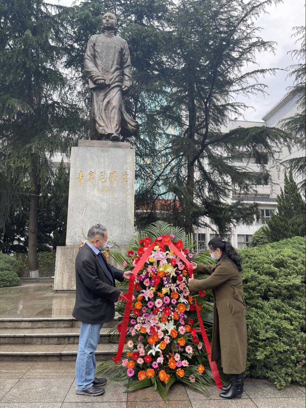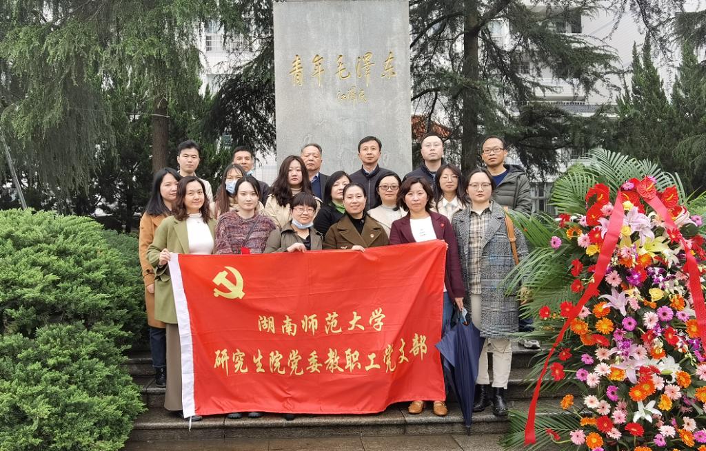 春雨绵绵中,研究生院参加活动的全体党员登上妙高峰,瞻仰青年毛泽东铜像。研究生院党委书记彭运石、教职工党支部书记胡水清缓步向前,仔细整理花篮绶带,随后带领研究生院全体党员向铜像行鞠躬礼并绕铜像一周,深切缅怀毛泽东同志为建立新中国作出的功勋伟绩。