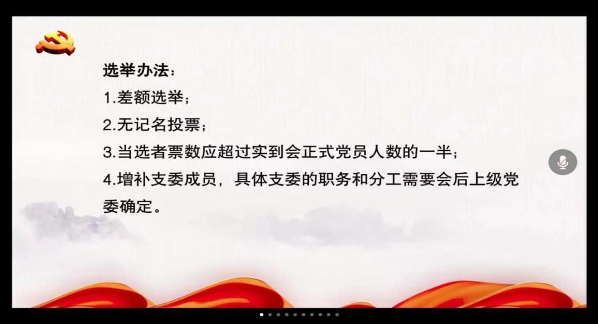 会议第二项议程,由原支部书记文虹月同志组织支部委员增补。此次支部委员增补严格按照《中国共产党章程》、《中国共产党基层组织选举工作条例》等有关规定进行。支部47名有选举权的正式党员实到会47人,符合相关规定要求。会议通过采用无记名投票选举方式和差额选举办法,选举了新一届支委。