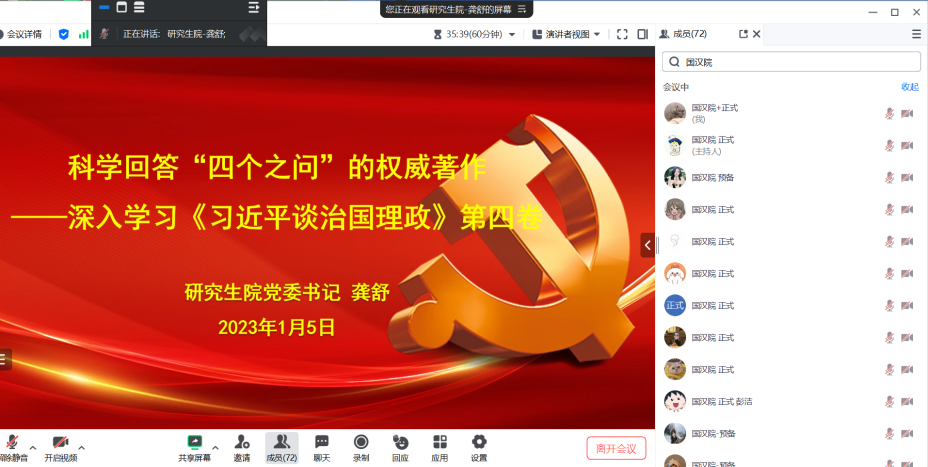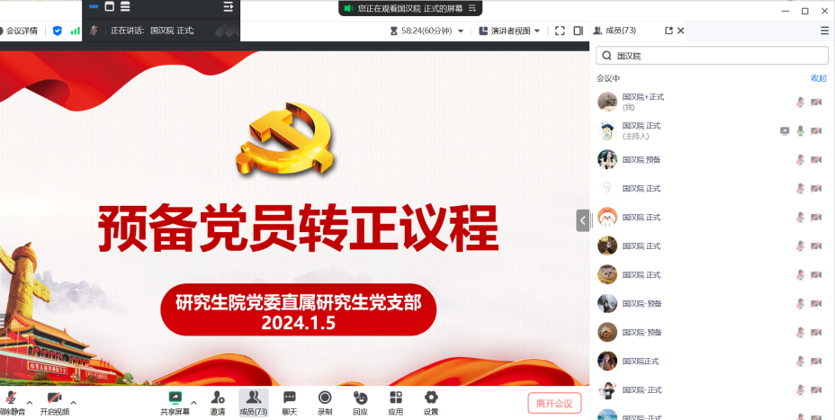 (通讯员 李沛媛)2024年1月5日18时,研究生院党委直属研究生党支部以腾讯会议形式召开支部大会。会议由支部副书记刘丹同志主持,研究生院党委书记龚舒、研究生院党委秘书兼直属研究生党支部第一书记朱倚萱及全体党员参与会议。