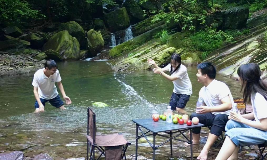 一路溯溪而上,蹚水而行,等寻到一处荫凉,“驾桌椅,搭天幕,有酒有肉听风眠。此时情绪此时天,无事小神仙。”逃离车流与喧嚣,听泉水叮咚,蝉鸣鸟叫,和好友打水仗,和和村主任一起吃果子,偷得浮生半晌欢。