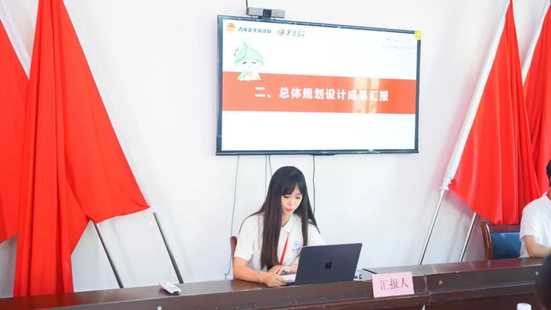 会上,实践团负责人秦怡分享了实践团在美丽乡村建设中的工作进展与成果:“历经10天的持续攻关,实践团先后推出特色产业文化长廊、中草药一条街对联、村口对联牌匾、村委文化墙、村界处村牌、景点导视牌、特色产品广告牌等近40项设计成果。此外,还有10面墙绘正在紧密推进。”随后,各建设板块负责人王秋敏、刘娅、蔡逸淳、贺强为依次介绍板块设计理念、文化内涵及具体功能。