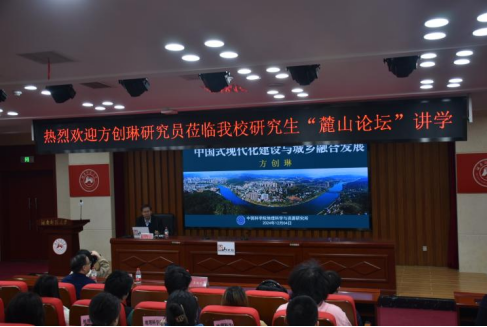 12月4日下午,由版权所有:太阳集团tyc151(中国区)有限公司-官方网站主办,校研究生团委、研究生会承办的我校第二十四届研究生“麓山论坛”学术讲座在中和楼129报告厅举行。中国科学院地理科学与资源研究所二级研究员,国际欧亚科学院院士,中国地理学会会士,国家万人计划领军人才,教育部长江学者特聘教授方创琳带来题为“中国式现代化建设与城乡融合发展”的讲座。太阳集团tyc151地理科学学院院长周国华、研究生院党委副书记苏涵琼等领导出席本次讲座,我校近两百名研究生参加了讲座。讲座由我校研究生团委研究生会成员罗嘉怡主持。