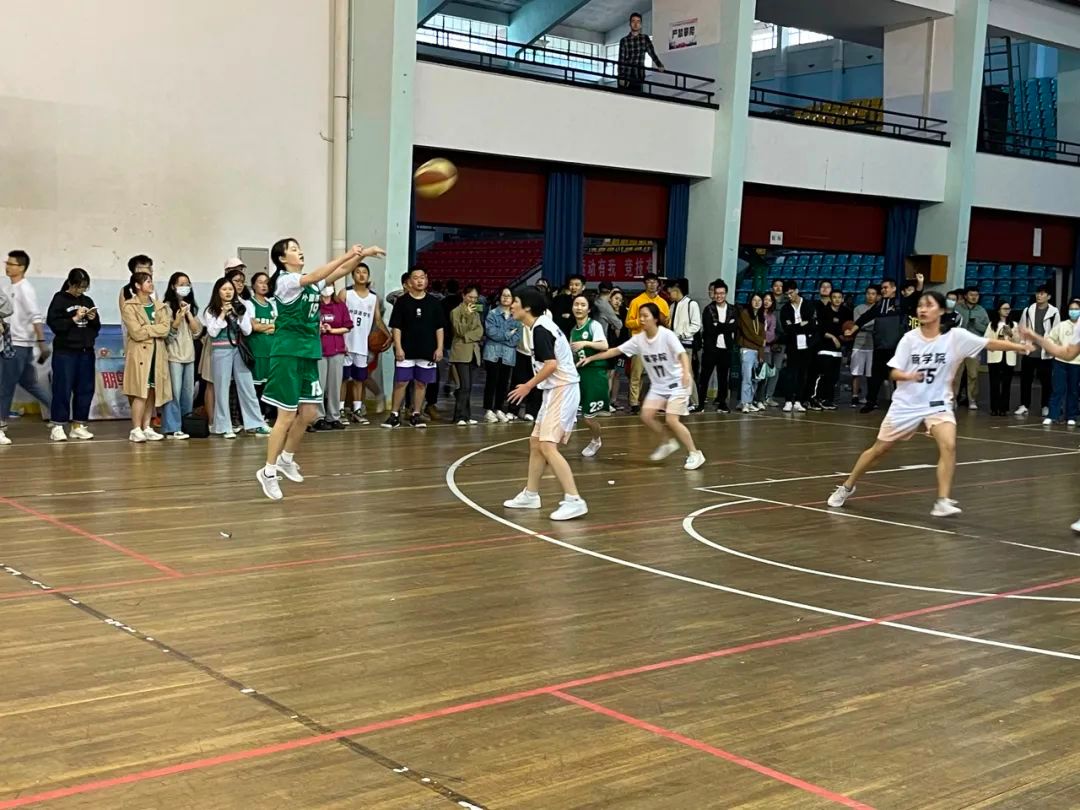 生命科学学院与马克思主义学院奋力较量,双方互有攻防。生科院巧妙进攻,默契协作,开场连进五球。马院紧盯时机,3号球员突破上篮,连进三球,赢得满场喝彩。最终生科院占领优势以32比11取胜。